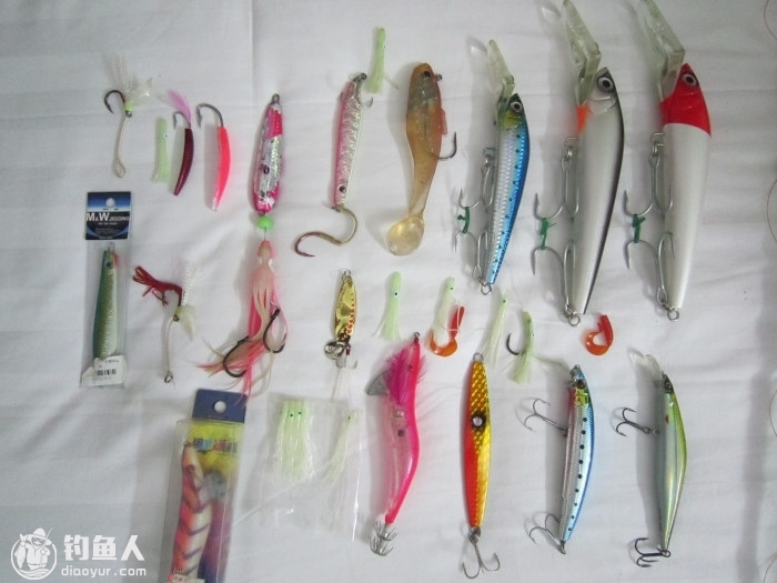 两大饵,两小饵,都是硬饵。大的是给马鲛准备的,小的应该是钓烟仔的吧。然后就是小艇中速拖着线在岛礁附近转来转去,等着鱼儿上钩,在大概二十分钟左右,宝哥镇定的说了句,好像上钩了。果然,他的那根杆这时已经很弯了,怕鱼串线,赶紧停船收线,等大家七手八脚的收完线时,鱼已经弓到船边了,但依然生龙活虎的上跳下窜。姐夫在船边瞅着机会把它提了上来,阿水说是条蓝鳍。提劲啊,赶紧继续!