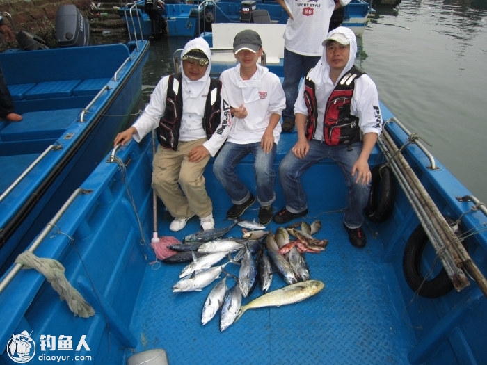 甩、收,甩、收。鱼咬钩了,弓鱼。不咬,继续甩、收,甩、收。这阵,是大家收获的主要阶段,累了,换人休息一下,再来。我跑的比钓的多,中了五条,只上来两条,都是烟仔。三条弓的时候脱钩了。就这样,也不知搞了多久,到最后大家都精疲力尽了,甩不动了。于是,还是用省力的办法,拖吧,象早上一样,拖马鲛吧。